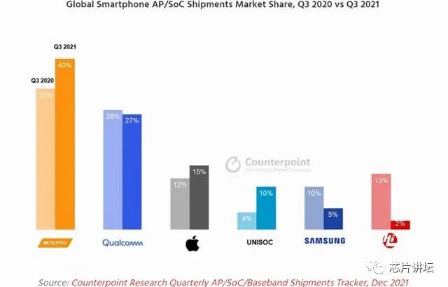 在很多企业认真搞芯片的同时,也有一些企业只为自己的私利投机取巧、招摇撞骗。从骗取11亿研发费用,拖累中国芯片行业发展的“汉芯”造假事件,到投入1280亿元拿光刻机做抵押贷款却没有生产出一颗芯片的“弘芯”。着实让期盼真正“中国芯”的人心寒。但这也是在追赶路上要解决的问题之一,外有对手、内有“硕鼠”。不过我们还是可以看到中国企业在一点点缩小差距,PC方面涌现出飞腾、鲲鹏、海光、龙芯、兆芯、申威等头部厂商,手机soc方面,像海思、紫光展锐等企业也崭露头角。在Counterpoint发布2021年第三季度全球智能手机芯片市场报告中,紫光展锐排名第三。而受最新美国芯片规则的影响,曾经位列2020 年上半年前十大半导体厂商第十位的海思排名急剧下降。