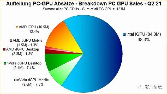 1968年,罗伯特·诺伊斯和戈登·摩尔创立了英特尔,至今已经基业长青了50多年。市场调研机构JPR发布了2021年二季度GPU市场份额报告(整个GPU图形芯片领域,含独显和集显),英特尔以68.3%的绝对优势位居第一位,AMD和NVIDIA分列二三位。