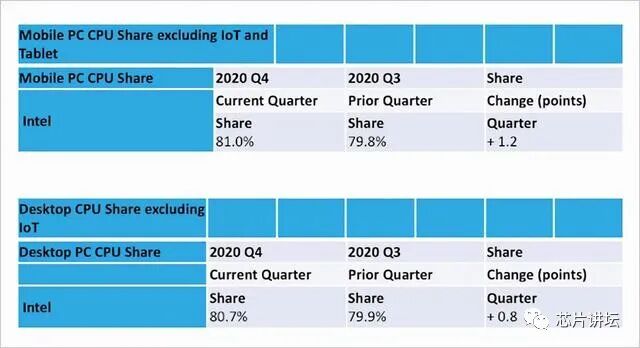 英特尔垄断一样的存在有多恐怖?Mercury Research发布的2020年Q4全球CPU市场份额数据显示,英特尔在台式机CPU市占率达到了80.7%。移动PC CPU市占率达到了80.7%。也就是说,在CPU行业里,英特尔霸主地位不可撼动。