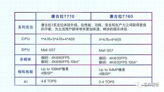 唐古拉T760则是四核A76加四核A55 CPU、Mali-G57 GPU,AI算力最高2.4TOPS,支持4K30fps视频编码、4K30fps 10-bit视频解码,最高6400万像素摄像头。