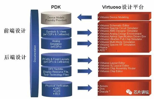 当然了,EDA软件并不只是画电路这样的简单,它最大特点是与芯片代工厂有着紧密的联系,在设计的时候,我们需要代工厂提供数据包,也叫做PDK, PDK指的是芯片设计中用到的一些逻辑单元,比如:锁存器、晶体管等等,像这种逻辑单元,工程师可以直接使用,无需再设计,这样可以帮助工程师节约更多的设计时间,同时这个数据包还会不断优化与更新,而且还可以绑定和验证EDA的功能,通常只支持当前最新版的EDA软件,这是EDA软件的一大利器。