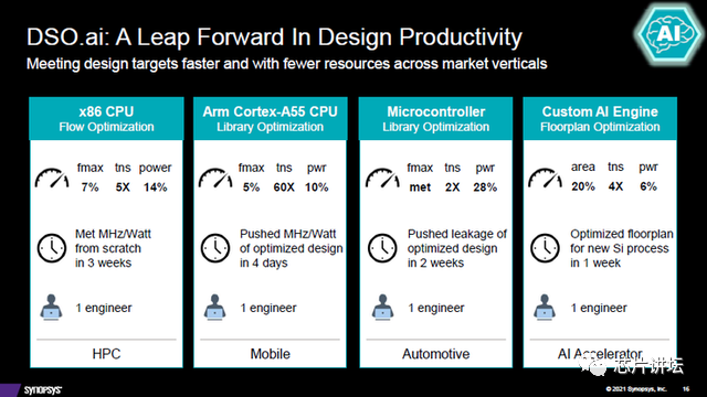 以新思科技的DSO.ai为例,美国头部IDM厂商采用DSO.ai后成果显著,芯片设计的时间提升2-5倍,SoC芯片能耗整体提升9%。将DSO.ai应用于不同类型芯片的设计流程,仅需一位工程师就能带来显著的时间节省和性能提升。