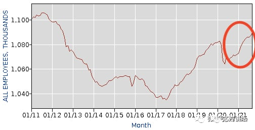 图:2021年,电子制造业就业人数逐月稳步攀升