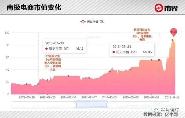 倒腾泰山石油元气大伤后,蒋学明一度淡出资本市场。直到其2012年再度出手,推动阳光油砂、东吴水泥上市。而2014年入主新民科技,堪称神来之笔,新民科技随后被“贴牌大王”南极电商于2015年借壳上市,公司市值也开始“扶摇直上”。
