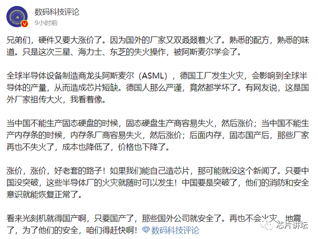 在阿斯麦工厂发生火灾的消息传出后,有长期关注电子领域的微博网友分析:硬件又要涨价了。
