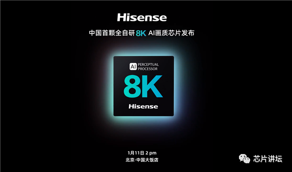 1月9日下午消息,海信电视官微预告,中国首颗全自研8K AI画质芯片将于1月11日下午14点在北京中国大饭店发布。