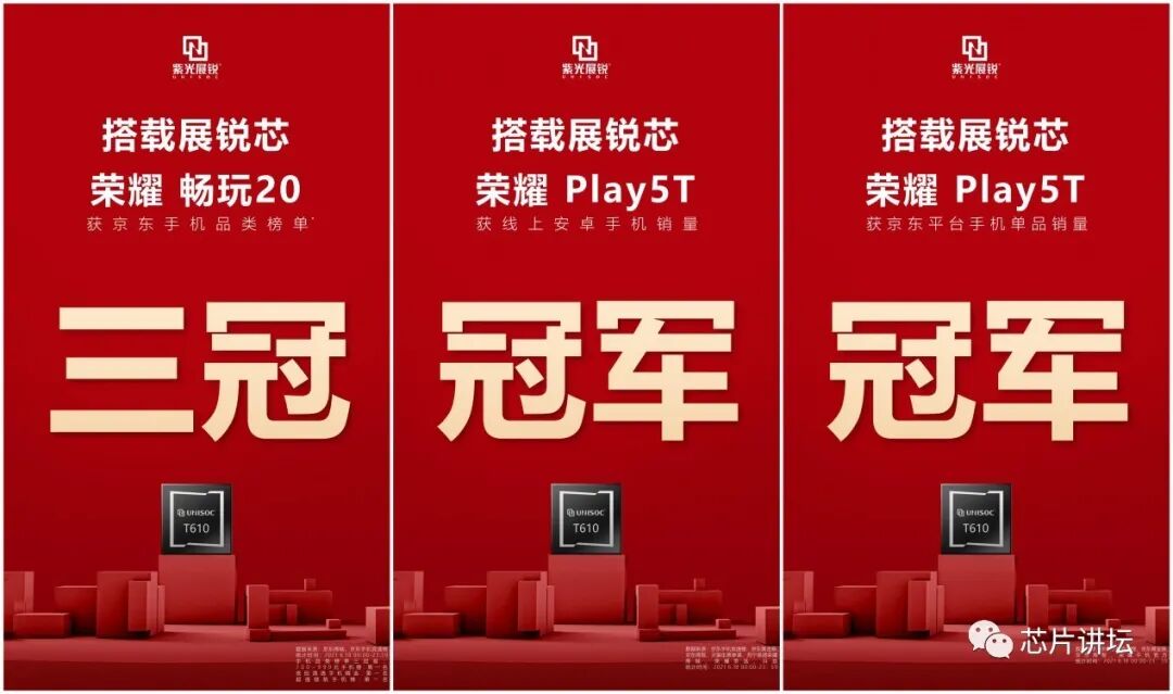 今年6月的京东618购物节上,搭载展锐手机芯片T610的荣耀畅玩20获得手机品类榜单三冠,荣耀Play 5T获线上安卓手机销量和京东平台手机单品销量双冠军。