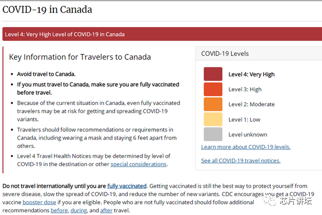 然而奇怪的是,在CDC发布疫情报告的同时还做了一个奇怪举动,疾病控制和预防中心还将邻国加拿大的旅行警告级别提高到“四级(非常高)”,当天的简报中很少提及本土的情况,而是大篇幅报道“鉴于加拿大目前的新冠疫情,即使是完全接种疫苗的旅行者也有感染和传播新冠变异株的风险。”所以要求美国民众谨慎去加拿大旅游,且至少要完全接种疫苗。