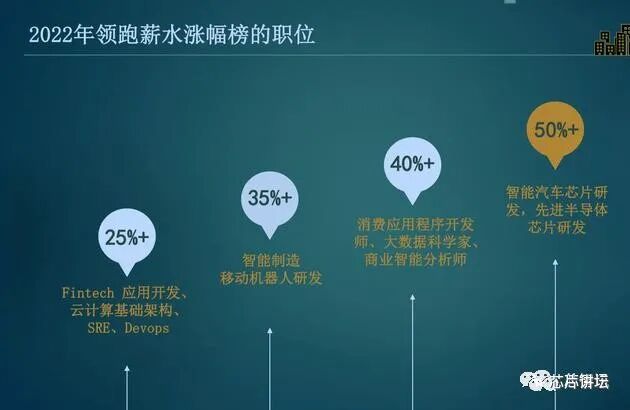 根据调研,宋倩表示,具体到岗位,2022年领跑薪水涨幅榜的职位排名第一的是智能汽车芯片和先进半导体芯片研发,涨幅超50% ;消费应用程序开发师、大数据科学家、商业智能分析师涨幅超40% ;智能制造移动机器人研发涨幅超35% ,云计算基础架构等职位涨幅超25% 。