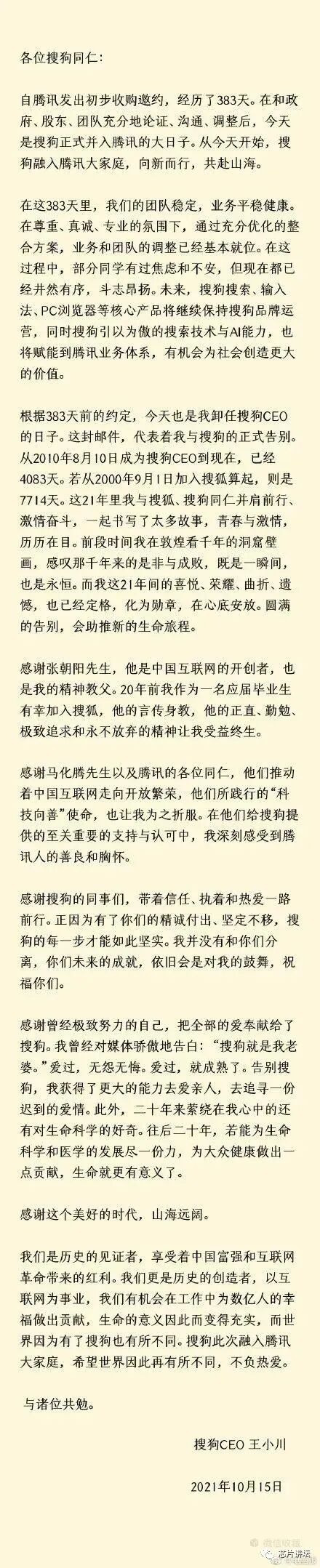 10月15日,搜狗CEO王小川发布内部邮件,宣布卸任搜狗CEO。
