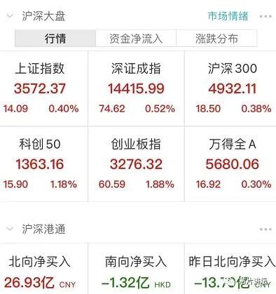 截至收盘,沪指涨0.4%报3572.37点,深成指涨0.52%报14415.99点,创业板指涨1.88%报3276.32点;两市合计成交9890亿元,北向资金净流入26.93亿元。