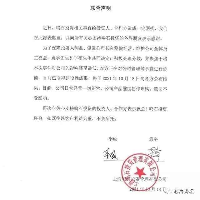 今日凌晨3点40分左右,鸣石投资微信公众号深夜发布联合声明,称:“为了保障投资人利益、促进公司长久稳健经营、维护公司全体员工权益,袁宇先生和李硕先生共同决定:积极处理分歧,并聚焦于将本次事件对公司的影响降至最低。双方正在对公司管理等事宜进行协商,目前已取得建设性成果,将于2021年10月18日向各方公布结果。目前,公司日常经营一切正常,公司产品继续暂停申购,赎回不受影响。”