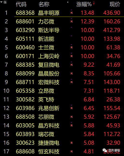半导体板块表现强势,斯达半导、新洁能、上海贝岭、拓中股份等涨停,宏微科技、长川科技、时代电气等涨超10%。