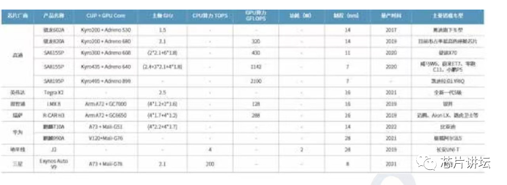 图4 主流座舱芯片供应商产品