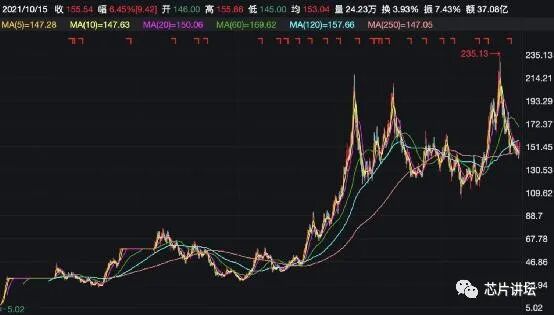 虽然半年报业绩预喜,但8月份以来,兆易创新股价却是跌跌不休。截至10月15日收盘,该股期间已经累计跌超32%,现报155.54元,总市值为1035亿元。