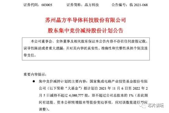 除了兆易创新外,近期还有多只半导体概念股同样遭大基金减持。10月15日晚间,晶方科技发布公告称,公司股东国家集成电路产业投资基金股份有限公司(简称“大基金”)拟计划自2021年11月6日至2022年2月5日减持不超过408.08万股,即不超过公司总股本的1%。