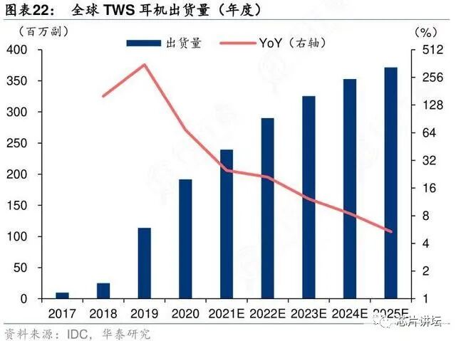 IDC数据显示,2017年到2021年,TWS耳机市场出货量一直速增长。预计到2025年,TWS耳机出货量将达到3.72亿副。快速增长TWS耳机市场,成为了很多产业链企业发展机遇。