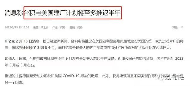 据媒体2月15日报道,台积电方面传出消息,原定在美亚利桑那州建造的5nm晶圆厂,将往后推迟3-6月,而且也已告知供应商,原计划在今年9月份搬入的芯片生产设备材料等等,将推迟至明年2-3月份。