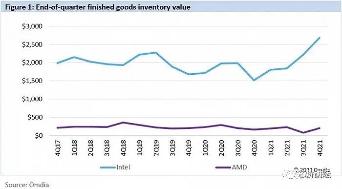超大规模云服务提供商亚马逊、谷歌和微软纷纷部署基于AMD的服务器是拉动增长的一个重要因素。市场对AMD CPU的强劲需求意味着,尽管AMD的产量自2017年以来增长了数倍,但该公司的成品库存价值并未增加。相比之下,看到英特尔的成品库存已经连续五个季度出现增长。当前英特尔的处理器库存价值处于历史高点。这一趋势表明,英特尔对过去一年丢失的市场份额猝不及防,尤其是在2021年四季度。该公司目前的成品库存价值达到近27亿美元,而AMD只有1.97亿美元。