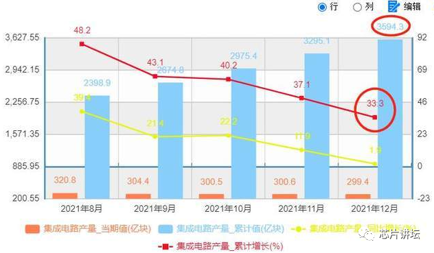 国内芯片生产数据出炉,根据国家统计局给出的数据显示,2021年我国集成电路生产芯片3594.3亿颗,同比增长33.3%,平均日产量为10亿颗芯片。