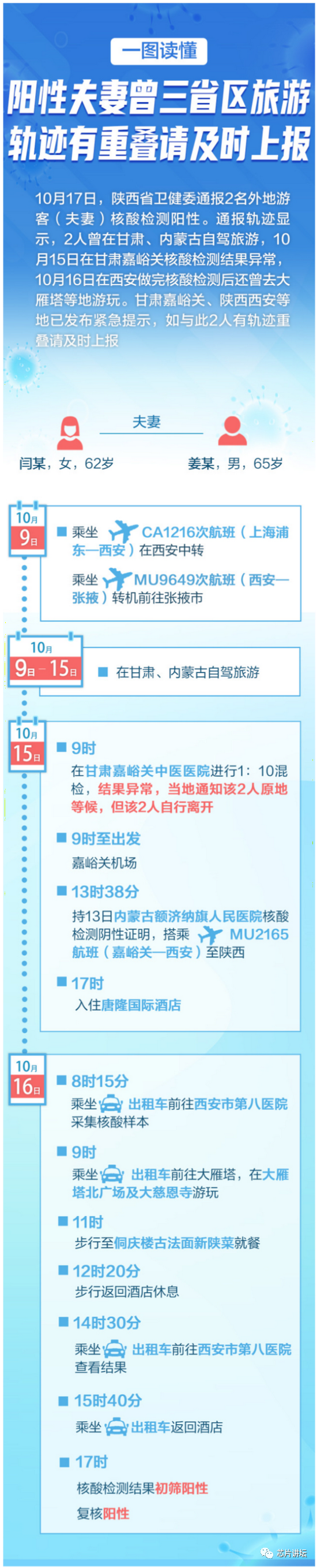 据西安通报消息,10月9日8时,该2人由上海浦东机场搭乘CA1216航班,于10时40分到达西安咸阳国际机场,13时54分转乘MU9649航班前往甘肃省张掖市;10月9日-15日,在甘肃、内蒙古自驾旅游;10月15日8时,持13日内蒙古额济纳旗人民医院核酸检测阴性证明搭乘MU2165航班(嘉峪关-西安),于当日15时抵达西安咸阳国际机场,后乘坐出租车于17时到达西安唐隆国际酒店(曲江新区雁南四路98号),办理入住后未再出入其他公共场所。据调查,该2人10月15日9时在甘肃省嘉峪关市中医医院进行1:10混检,结果异常,当地通知该2人原地等候,但该2人自行离开。