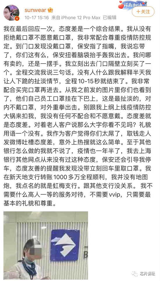 对于被质疑不戴口罩还要求负责人下跪@sunwear 称,强烈建议上海银行把9月30的监控拿出来看看保安是如何表现的,我没有任何不愿意戴口罩的表现,这个过程估计也就15秒,我非常配合,但他的态度极其令人不爽。银行那么多监控你们最好能放出我逼你们下跪高高在上故意找茬的证据。有些人可能怂惯了,吃亏吃习惯了,被人甩脸色习惯了,当孙子当习惯了,但我可不行。