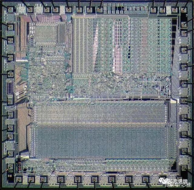 1801 CPU系列共推出七款,除第一款采用Elektronika NC架构,其余6款都是采用LSI-11架构。第一款采用LSI-11架构的1801系列CPU是1982年推出的K1801VM1,采用NMOS工艺,裸片面积是25mm2,晶体管数量达到50000个,采用的陶瓷平面封装形式。下图是K1801VM1的Die照片和芯片照片。