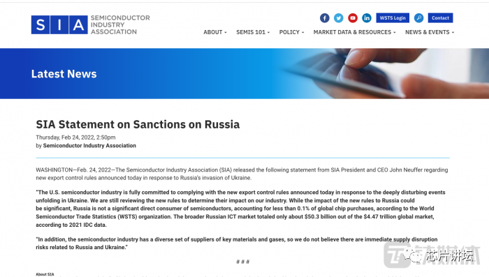 对此,英特尔、台积电、戴尔、苹果、Google等重要科技企业都已暂停与俄罗斯企业的合作,美国半导体行业协会(SIA)则在官方网站上发布消息称,它们正在评估新规则对全球半导体行业的影响。