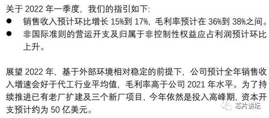 高永岗介绍,展望2022年,公司预计全年销售收入增速会好于代工行业平均值,毛利率高于公司2021年水平。为了持续推进已有老厂扩建及三个新厂项目,2022年依然是投入高峰期,资本开支预计约为 50亿美元。