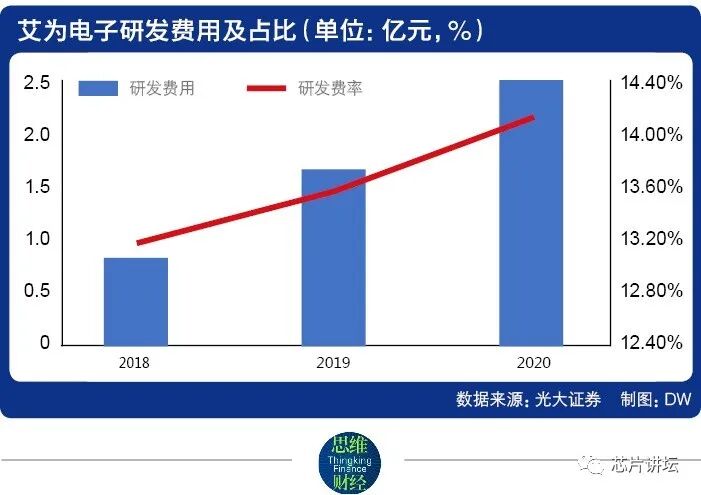 此外,艾为电子的高研发投入也是影响公司经营业绩的主要因素之一。报告期内,公司研发费用由 2018 年的0.91亿元上升至2020 年的 2.05 亿元,研发费用占比不断提升,复合增长率高达49.92%。