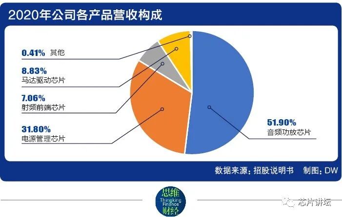 从产品线角度来看,报告期内,音频攻放芯片和电源管理芯片为公司最主要的产品,两者贡献超过80%的营收。此外,随着5G网络的商业化建设及手机市场对触觉反馈功能需求的增加,公司射频前端芯片和马达驱动芯片需求扩张明显,增速较快。