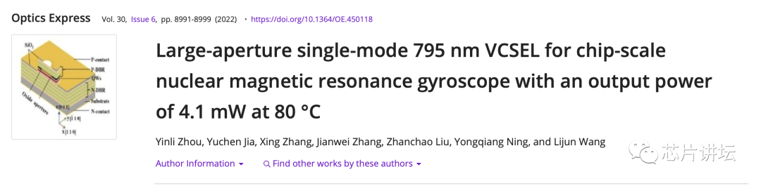 近日,中科院长春光机所在量子陀螺专用芯片研发上取得进展,研制出795纳米的垂直腔面发射激光器芯片,具有实际应用价值。相关成果发表在《Optics Express》期刊。