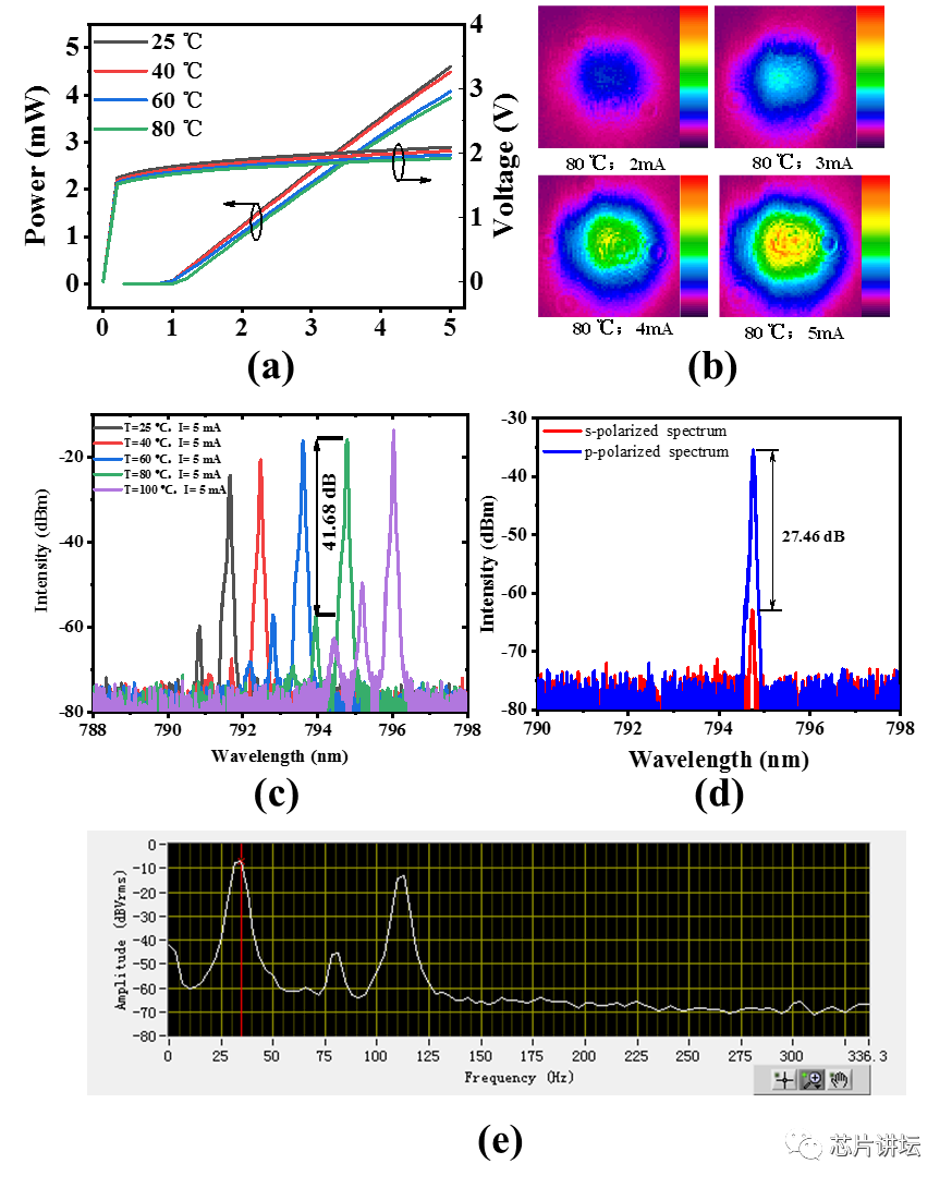 (a)VCSEL在不同温度下的P-I-V特性曲线,内插图为芯片实物图,(b)80℃不同电流下VCSEL的近场光斑,(c)VCSEL的光谱特性,(d)VCSEL的偏振特性,(e)采用VCSEL作为泵源的量子陀螺仪信噪比测试结果,图片来自中科院长春光机所