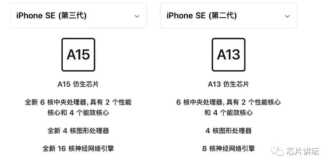 ▲ iPhone SE(第三代)将上代的 A13 芯片升级成了 A15
