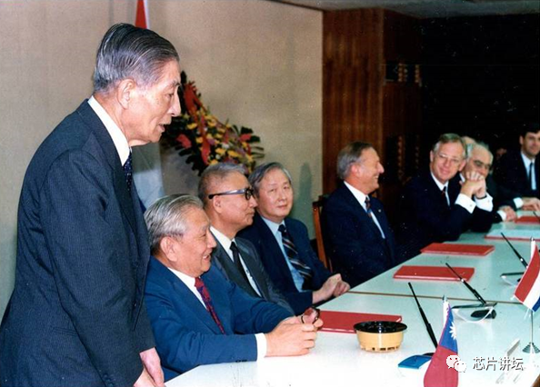 图注:84年,时任工研院院长的张忠谋(左4)与荷兰飞利浦签约合作,左1立者为时任行政院科技顾问小组召集人李国鼎