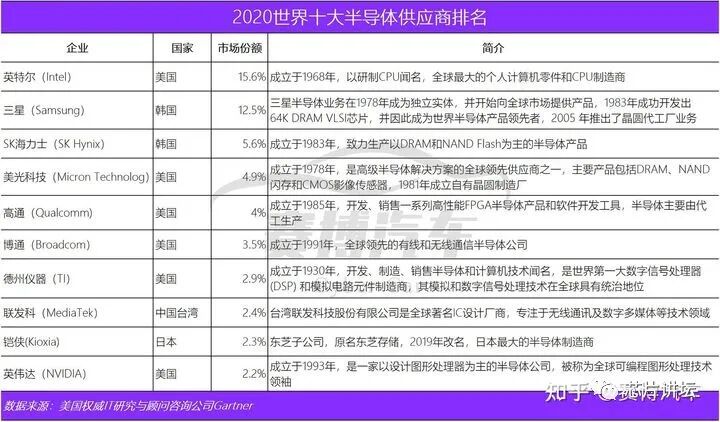 根据Gartner数据,2020年全球半导体销售额增长7.3%达到4498亿美元。2020世界十大半导体供应商排名及其份额为英特尔(15.6%)、三星(12.5%)、SK海力士(5.6%)、美光科技(4.9%)、高通(4%)、博通(3.5%)、德州仪器(2.9%)、联发科(2.4%)、铠侠(2.3%)、英伟达(2.2%)。