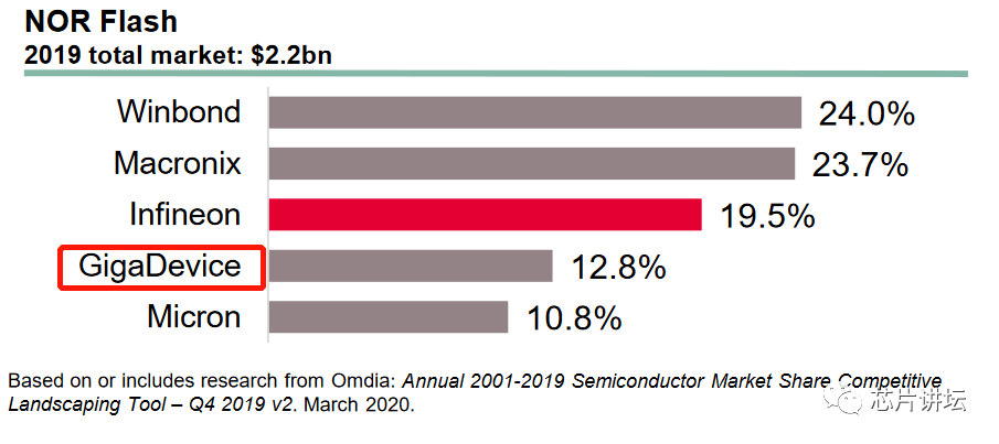 兆易创新的NOR Flash位居全球第四在去年就早有耳闻,据CINNO Research对2019第二季度存储产业研究报告显示,公司在NOR Flash领域超越美光,以13.9%的市场份额首度站上全球第四名的位置;据Web-Feet Research对2019第三季度存储产业研究报告显示,公司Nor Flash市场份额提升到18.3%,超越赛普拉斯排名全球第三,前二名分别为华邦电子和旺宏电子。而在英飞凌的财报中,结合Omdia的数据研究,兆易创新以12.8%的市场份额排在第四位。