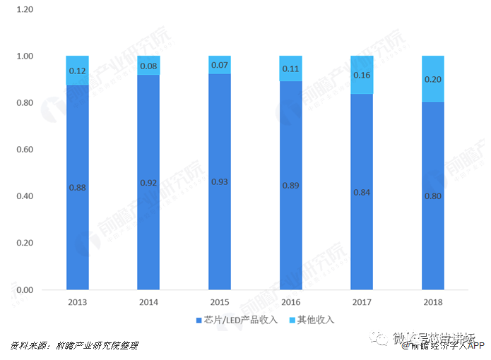 公司主营业为为LED芯片业务,2013-2018年,公司LED、芯片产品收入均占比公司全部营业收入的80%以上,2015年公司LED、芯片业务占比达到了93%。近年来,公司加快LED产业链的垂直一体化布局,产品由原来单一的外延片及芯片逐步向上游原材料(衬底、气体)和下游高端LED应用产品拓展,完善全产业链生产,公司LED芯片产品占比逐渐下降,材料收入占比逐渐上升,打造LED芯片全产业链布局。2018年,公司芯片及LED产品收入67.33亿元,较上年同比下降4.43%;材料、废料销售收入14.19亿元,较上年同比上升42.67%。