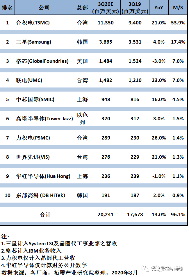 2020年第三季度全球前十大晶圆代工厂营收预测排名