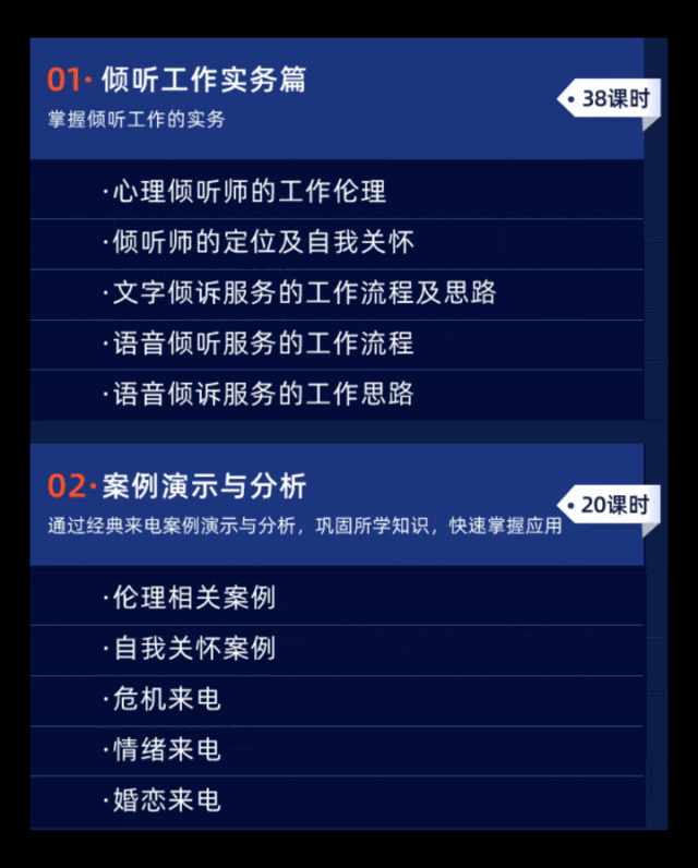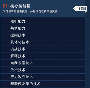 《心理倾听师培养计划》包含一阶+二阶的课程,学习过程是真正的师徒制的实操学习。