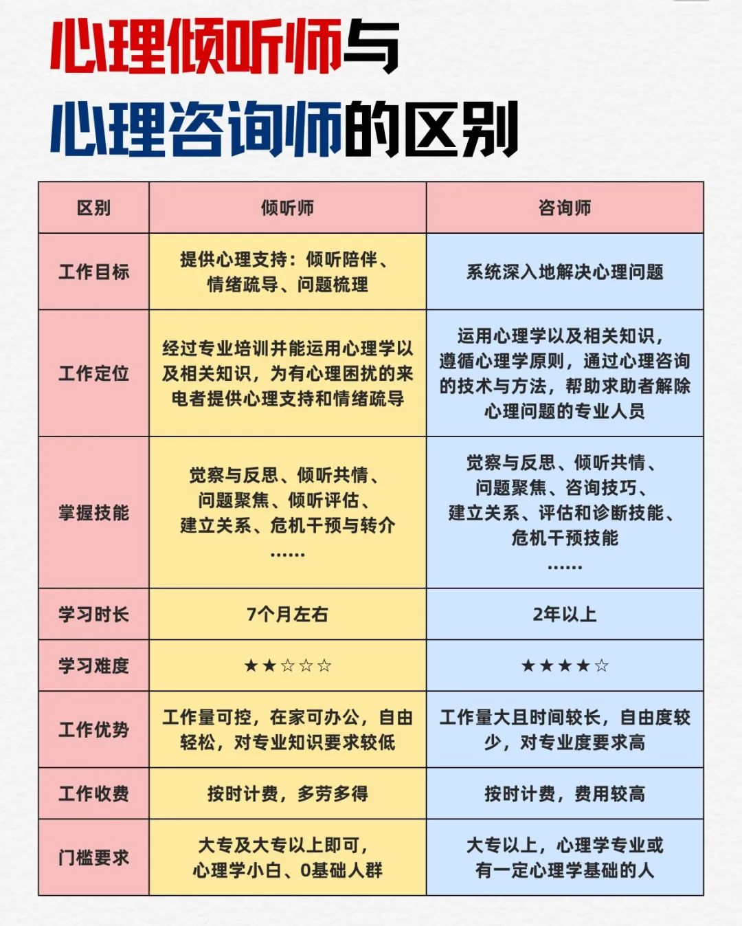 总的来说,心理倾听在生活中的适用范围更广,更多人可以寻求心理倾听师帮助,及时缓解情绪和处理心理困扰。