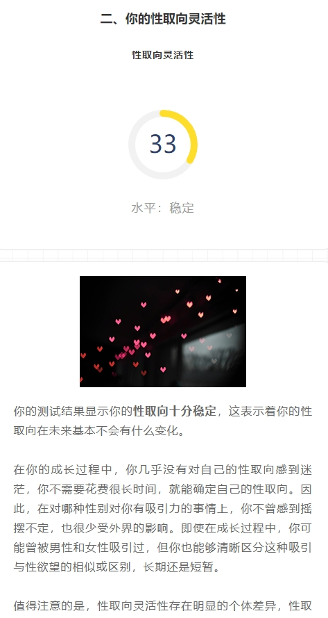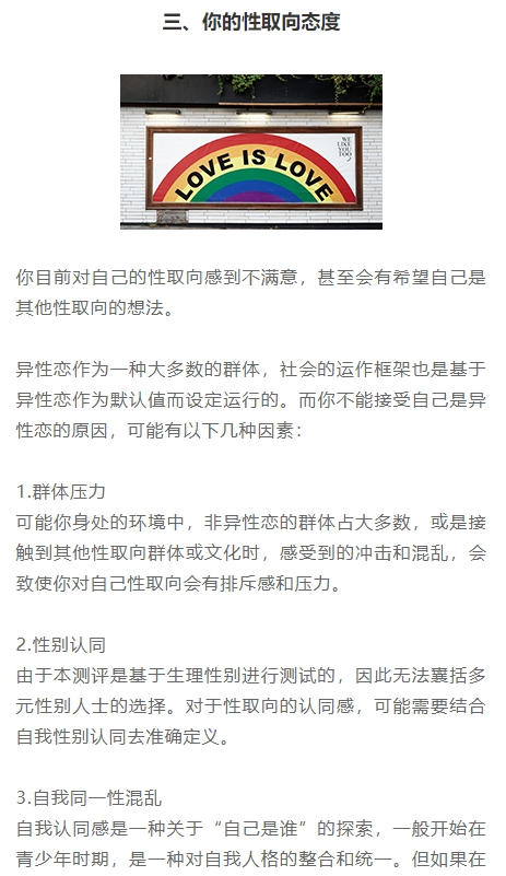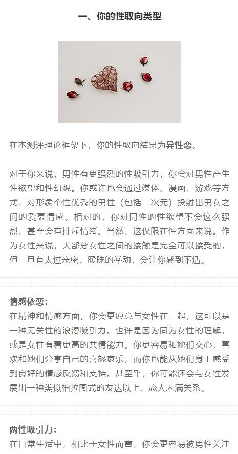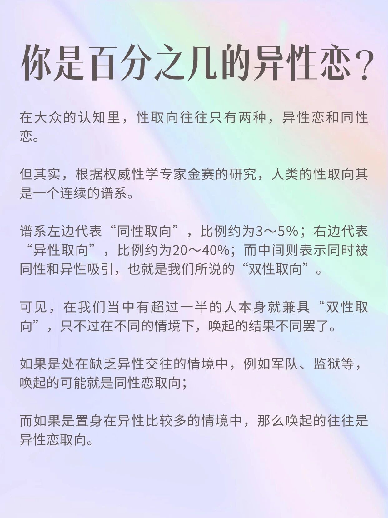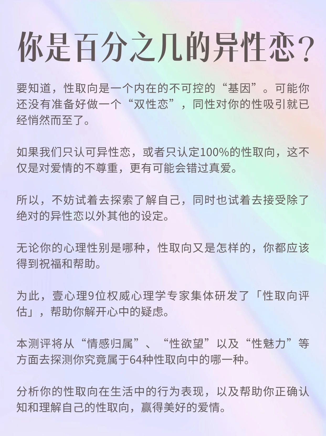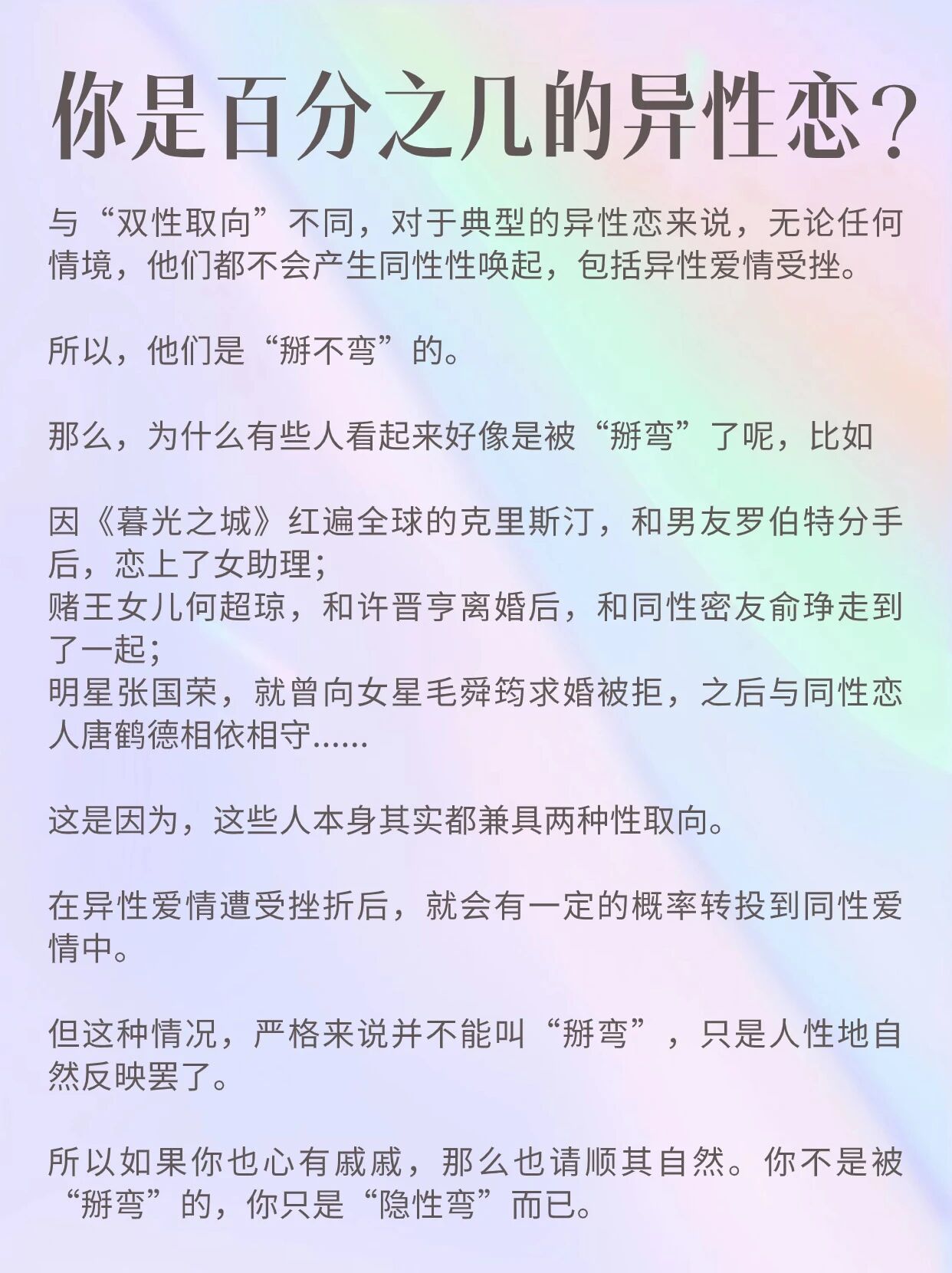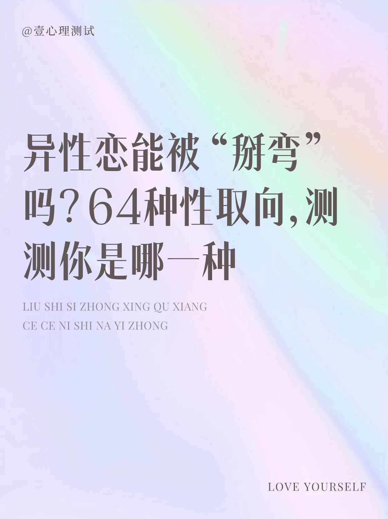 🤔你有没有想过,异性恋也能被“掰弯”。\x0a\x0a在大众的认知里,性取向往往只有两种,异性恋和同性恋。\x0a\x0a但其实,根据权威性学专家金赛的研究,人类的性取向其是一个连续的谱系。\x26amp;nbsp;\x26amp;nbsp;\x0a\x0a💙谱系左边代表“同性取向”,比例约为3~5%;\x0a❤️右边代表“异性取向”,比例约为20~40%;\x0a💕而中间则表示同时被同性和异性吸引,也就是我们所说的“双性取向”。\x0a\x0a可见,在我们当中有超过一半的人本身就兼具“双性取向”,只不过在不同的情境下,唤起的结果不同罢了。\x0a\x0a如果是处在缺乏异性交往的情境中,例如军队、监狱等,唤起的可能就是同性恋取向;而如果是置身在异性比较多的情境中,那么唤起的往往是异性恋取向。\x0a\x0a💁🏻♀️有些人本身其实兼具两种性取向。在异性爱情遭受挫折后,就会有一定的概率转投到同性爱情中。这种情况,严格来说并不能叫“掰弯”,只是人性地自然反映罢了。\x0a\x0a💌所以如果你也心有戚戚,那么也请顺其自然。你不是被“掰弯”的,你只是“隐性弯”而已。\x0a\x0a🧬要知道,性取向是一个内在的不可控的“基因”。可能你还没有准备好做一个“双性恋”,同性对你的性吸引就已经悄然而至了。\x0a\x0a如果我们只认可异性恋,或者只认定100%的性取向,这不仅是对爱情的不尊重,更有可能会错过真爱。\x0a\x0a👁️🗨️所以,不妨试着去探索了解自己,同时也试着去接受除了绝对的异性恋以外其他的设定。\x0a\x0a无论你的心理性别是哪种,性取向又是怎样的,你都应该得到祝福和帮助。\x0a\x0a为此,壹心理9位权威心理学专家集体研发了\x26lt;a target=\x26quot;_blank\x26quot; class=\x26quot;weapp_text_link\x26quot; data-miniprogram-type=\x26quot;text\x26quot; data-miniprogram-appid=\x26quot;wxbc580ce614919a91\x26quot; data-miniprogram-path=\x26quot;pages/evaluation/detail?scalePoolId=1404\x26amp;amp;sourceName=jingxuantuiwen\x26quot; data-miniprogram-nickname=\x26quot;壹心理读心树\x26quot; data-miniprogram-servicetype=\x26quot;0\x26quot; data-miniprogram-applink=\x26quot;\x26quot;\x26gt;「性取向评估」\x26lt;/a\x26gt;\x26amp;nbsp;,帮助你解开心中的疑虑。\x0a\x0a✔️本测评将从“情感归属”、“性欲望”以及“性魅力”等方面去探测你究竟属于64种性取向中的哪一种。\x0a\x0a✔️分析你的性取向在生活中的行为表现,以及帮助你正确认知和理解自己的性取向,赢得美好的爱情。\x0a\x0a\x26lt;a target=\x26quot;_blank\x26quot; class=\x26quot;weapp_text_link\x26quot; data-miniprogram-type=\x26quot;text\x26quot; data-miniprogram-appid=\x26quot;wxbc580ce614919a91\x26quot; data-miniprogram-path=\x26quot;pages/evaluation/detail?scalePoolId=1404\x26amp;amp;sourceName=jingxuantuiwen\x26quot; data-miniprogram-nickname=\x26quot;壹心理读心树\x26quot; data-miniprogram-servicetype=\x26quot;0\x26quot; data-miniprogram-applink=\x26quot;\x26quot;\x26gt;点击开始测试\x26lt;/a\x26gt;