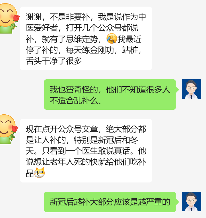 这个读者后来给我发了一些信息,就是说很多公众号都在说需要补一补,但目前这种新冠肆虐后,很多人体内湿热浊邪残留是较重的,直接补很容易导致虚不受补,并不一定对自身有益。