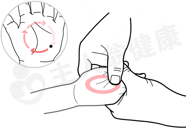 操作:用拇指端在大鱼际中点按揉,约揉200~400次。