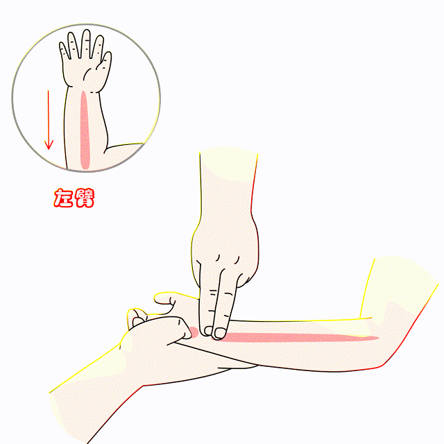 用食、中二指面自腕推至肘,称清天河水。100~300次