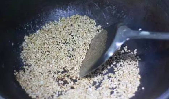 2、待水分控干,在普通炒锅中大火炒三分钟无水之后,转小火快速翻炒,中间不要停,待大米炒到金黄色就已经成功了,关火再翻炒一两分钟就OK啦。