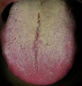 这是轻度积食的舌象,如果说孩子舌苔满布,黄白厚腻,舌质很红,出现如下图这类舌象,那说明食积化热较重了,如果饮食、推拿、中成药调理无效,则需要就诊找专业中医进行诊治了。