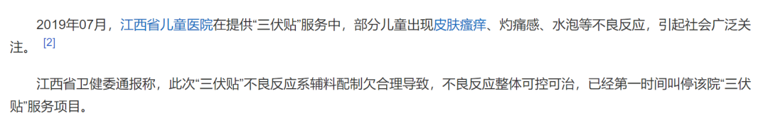 但你看下面图中的新闻,三伏贴起水泡被卫生执法部分认定为了医疗的“不良反应”,令医院暂停三伏贴业务。