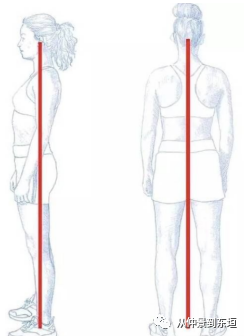 从背面看,后脑勺中点、肩胛骨连线中点、骶骨应该在一条线上,同时这条线的延长线应该落在两脚中间;