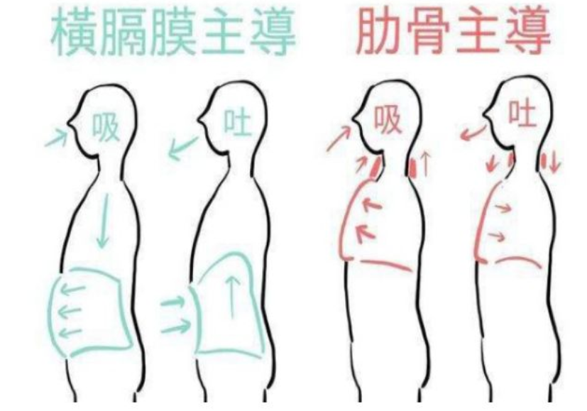 采用胸式呼吸(肋骨主导),尤其女性容易此呼吸模式,导致呼吸时胸廓向各方向扩张的功能下降,中医来讲则是气不沉丹田,长期引起肺肾气虚,很多人在吸气时,这样的错误呼吸方式时间长了会导致腰椎体疼痛、胸廓其他方向运动能力下降,每次呼吸的吸气量也会下降,加上膈肌的功能下降,而上斜方肌、斜角肌、胸小肌、上后锯肌等协助呼吸肌的过度代偿,引发颈肩不适;应采用腹式呼吸,即吸气时腹部稍膨大,气沉到肚脐,然后收缩腹部吐出,有意识的注意此呼吸模式,可以几个月或1,2年时间纠正过来。
